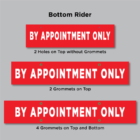 BY APPOINTMENT ONLY Riders serve as friendly reminders that interested buyers and visitors need to make an appointment with you in advance. Made with durable, weatherproof Coroplast 10mm, these riders are available in various sizes, grommet options, and riding styles. Shop at wholesale prices!