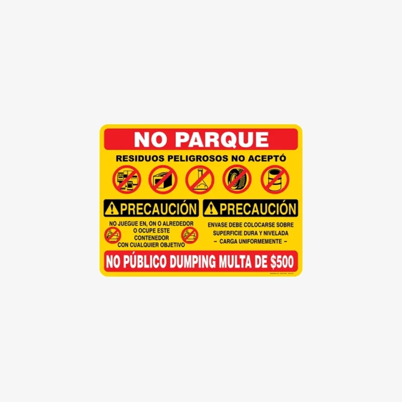 Spanish Multi Message Container Decal. Do Not Park No Hazardous Waste Accepted. Caution Do Not Play In, On Or Around Or Occupy This Container For Any Purpose. Caution Container Must Be Placed On Hard Level Surface. Load Uniformily. No Public Dumping $500 Fine.