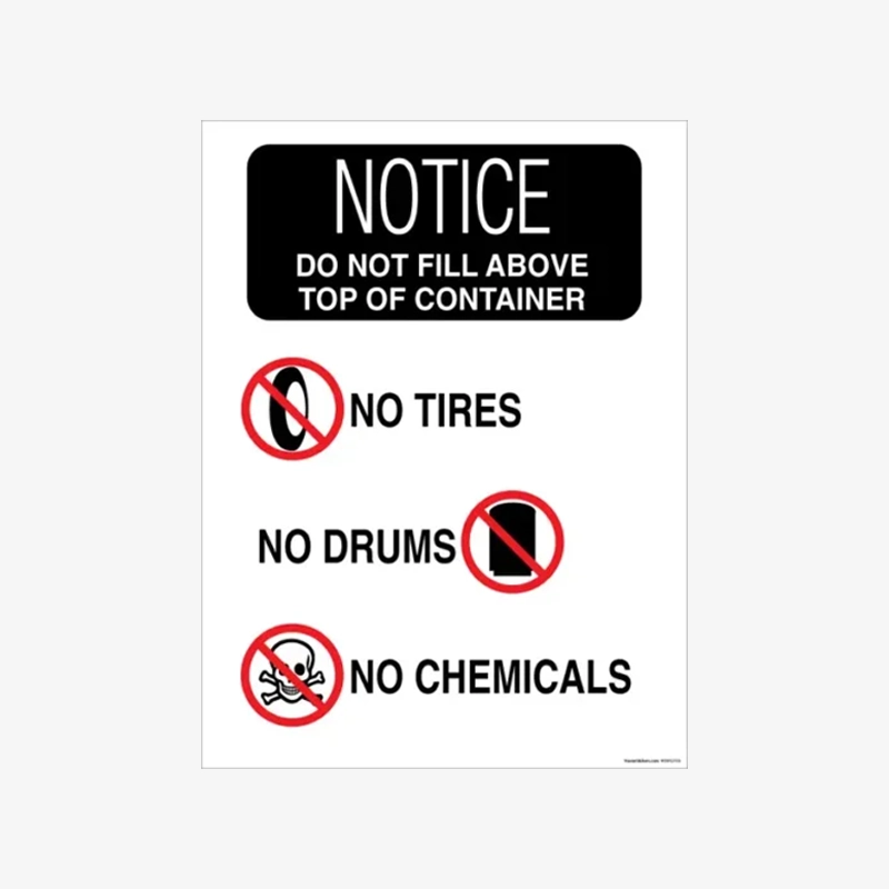 Notice Do Not Fill Above Top Of Container. No Tires No Drums No Chemicals. Container Sticker Decal