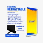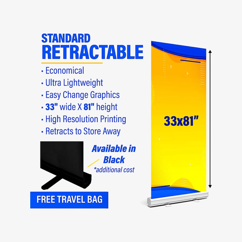Your graphic and messaging can be printed on either 13 oz vinyl or 9 oz polyester fabric. Premium and deluxe versions include an adjustable pole, allowing you to adjust the size of your display, while standard versions come with a non-adjustable pole. You can also enhance your display with optional LED display lights. Thanks to the durability, portability, and ease of use, our retractable banners will make your next event a standout success, complemented by professional-grade printing.