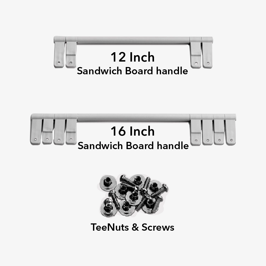 Sandwich Board Handles are made of extremely durable plastic with a strong steel rod. We offer two size options including 12-inch handles with 4 TeeNuts and screws and 16-inch handles with 8 TeeNuts and screws. Shop now!