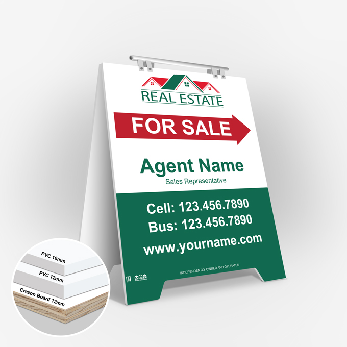 Sandwich Boards with Feet are durable, corrosion-resistant, and lightweight signs ideal for real estate advertising. Printed on either PVC or Crezon Boards, these signs feature two panels that assemble with a robust handle. The tough, weatherproof materials make them perfect for outdoor use. These high-quality sandwich boards are reusable without wear or fading. A variety of sizes and coating options are available for added protection. Shop at wholesale prices!